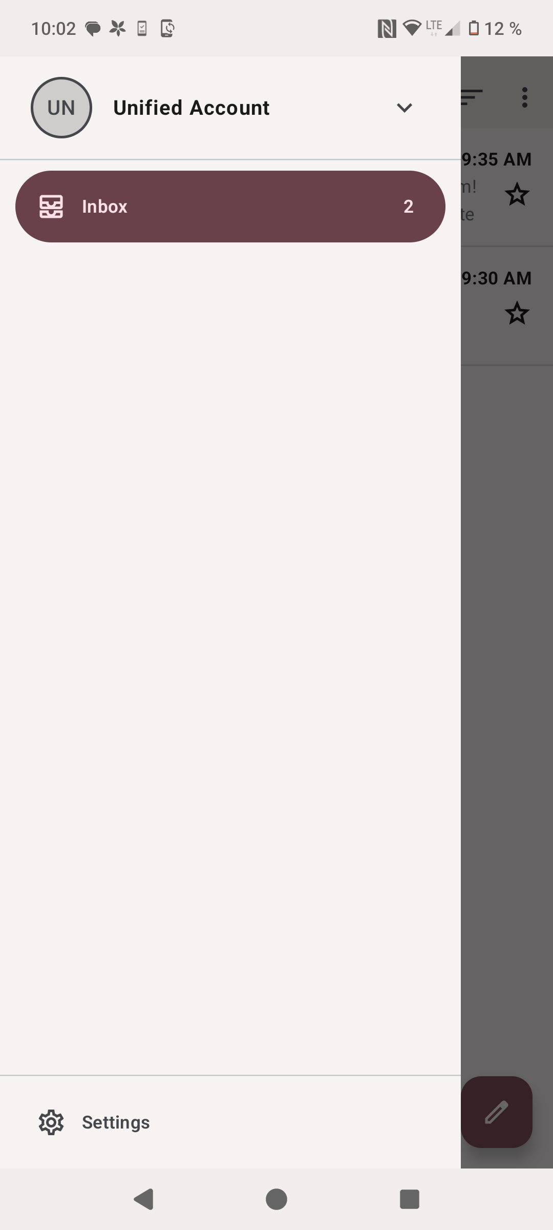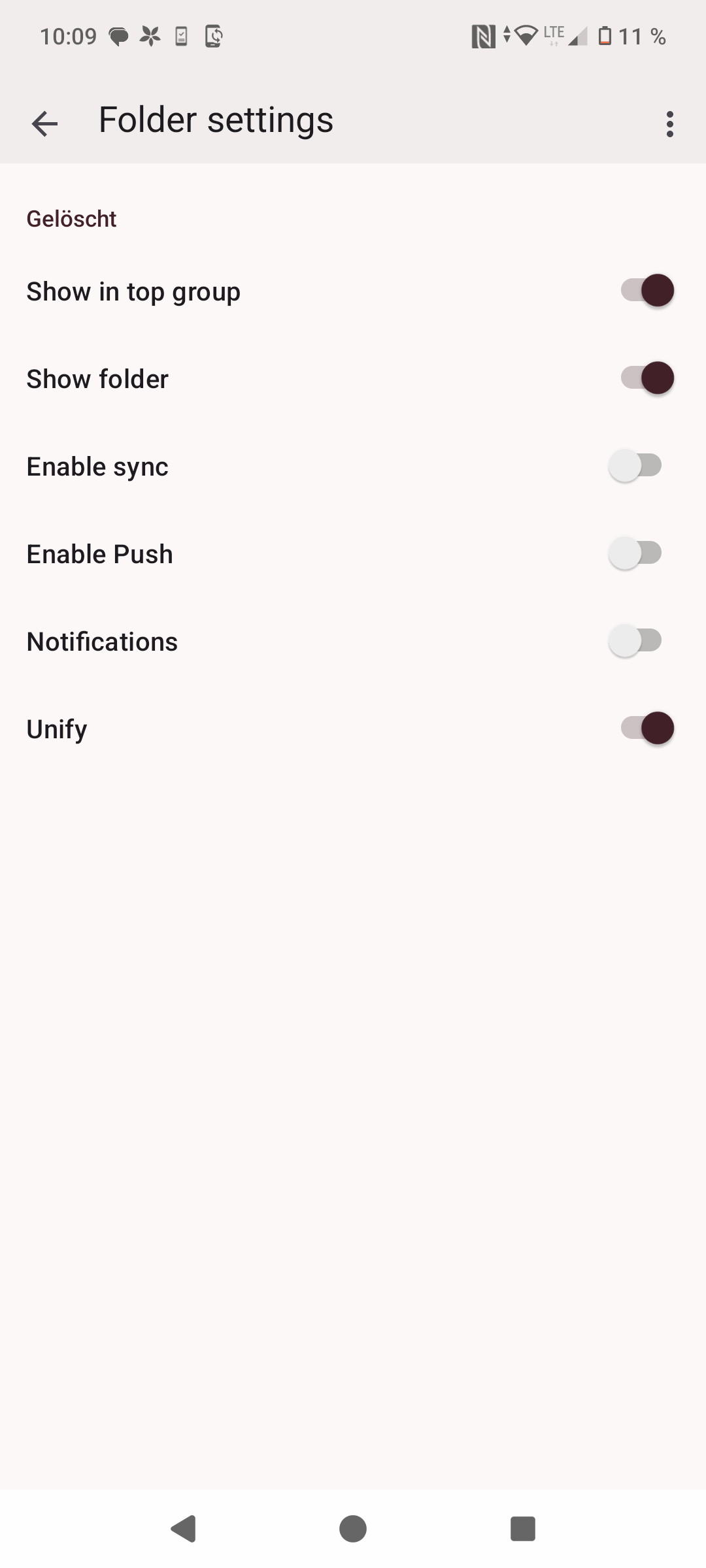 At the moment, there is only my (unified) Inbox showing. Changing Folder Settings for the different accounts (“Show in top group” and “unify”) doesn’t seem to be doing anything.